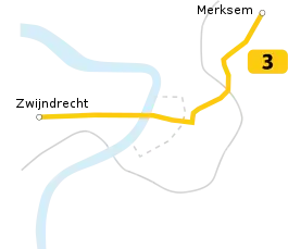 On February 16, 2002, route 3 was extended from Linkeroever to the Zwijndrecht-Melsele border, a 4,3 km trajectory, where a P+R facility was built.[2] On September 1, 2002, the route was once again extended, this time on a 1,6 km trajectory toward the newly built Keizershoek P+R in Merksem.[3]