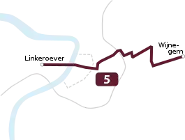 Tram route 5 is a tram route in Antwerp running from Linkeroever to Wijnegem that is operated by the Flemish transport company De Lijn. The modern route was put into service on March 4, 2006, initially connecting Linkeroever with Deurne. The tram route uses the Antwerp pre-metro between the stations Van Eeden and Schijnpoort.[1] On April 14, it was extended from the Wim Saerensplein in Deurne to the Wijnegem Fortveld terminus.