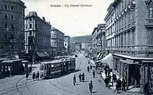 After the creation of the first horse-bus routes in 1860, mostly by the firm "Cimadori", the first horse-drawn tram followed in 1876, organized by “Società Triestina Tranway (STT)”, a Belgian-owned society, also known as “Triester Tramway Gesellschaft” or “Societé de Tramways de Trieste”.[1] The first route, the “via Torrente-corsia Stadion-Boschetto” route, was inaugurated on March 30, 1876.[2] In the later 1800s, the horse-drawn tram network was significantly increased. In 1900, its maximum expansion, the following routes were in service:[1]