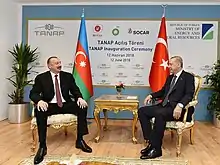 In spring 2012, the process of conducting the technical-economic feasibility study was launched.[6] On 26 June 2012, President of Azerbaijan Ilham Aliyev and then Prime Minister of Turkey Recep Tayyip Erdoğan signed a binding intergovernmental agreement on the pipeline.[7][8] Also, the agreement was signed by Azerbaijani Industry and Energy Minister Natig Aliyev and Turkish Minister of Energy and Natural Resources Taner Yildiz. The initial agreement on organizational issues between BOTAŞ and SOCAR was signed by Natig Aliyev and Taner Yildiz, SOCAR President Rovnag Abdullayev and BOTAŞ Deputy Director General Mehmet Konuk. The host country agreement was signed by Yildiz and Abdullayev.[9][10] On March 17, 2015, both Erdoğan and Aliyev met with Giorgi Margvelashvili, President of Georgia, in the city of Kars in Eastern Turkey to formally lay the foundations for the pipeline and marking the work as started.[1]