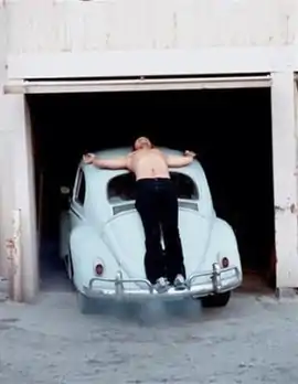 On April 23, 1974, performance artist Chris Burden was crucified shirtless onto the back of a pale blue Volkswagen Beetle.[1] Burden stood on the car's rear bumper and leaned backwards.[2] His attorney hammered two nails through his open palms into the roof. Three other assistants ran the engine and opened the garage door, which opened into an alley called Speedway in Venice, California.[1] The assistants rolled the car out of the garage, where it ran while stationary for two minutes with the engine at full throttle.[2] Fifteen of his friends were there, having been invited but not briefed on what to expect.[1]