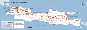 The Trans-Java Toll Road is a tolled expressway network that runs from Port of Merak in Cilegon, the main link between the island of Sumatra and Java, to Banyuwangi, the eastern end of the island in Indonesia and the main link between the island of Java and Bali. It mainly runs through the northern coast of the island, except for the section between Semarang and Surabaya, where it runs through the centre and south of the island. It runs through five of the six provinces on the island of Java (DI Yogyakarta being the sole exception), connecting the major cities of Jakarta, Cirebon, Semarang, Solo, and Surabaya. The toll road is the land transportation backbone of the island and is the most important toll road network of the country. The toll road has a total length of 1,167 kilometres (725 mi).[1]