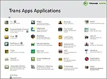 While there has been much success, TransApps initially relied upon the Dell Streak, which was discontinued in 2011. Since then, the TransApps platform has adjusted to function on a range of hardware, including Motorola Xoom, Galaxy Note, and Samsung S4. In addition to security, additional emphasis has also been placed on usability and visualization via the iWarrior SBIR that falls under TransApps.[7] In 2012, TransApps was identified as one of the top 25 C4ISR breakthroughs of the year.[8] In April 2013, DARPA awarded a contract to GXM Consulting to continue to expand the functionality and robustness of the smartphones.[9]
