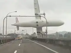 ![]() A frame from a dashcam video showing Flight 235 clipping a vehicle and the Huandong Viaduct, seconds before crashing | |