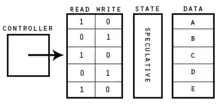 The abstraction of atomicity in transactional memory requires a hardware mechanism to detect conflicts and undo any changes made to shared data.[3] Hardware transactional memory systems may comprise modifications in processors, cache and bus protocol to support transactions.[4][5][6][7][8] Speculative values in a transaction must be buffered and remain unseen by other threads until commit time. Large buffers are used to store speculative values while avoiding write propagation through the underlying cache coherence protocol. Traditionally, buffers have been implemented using different structures within the memory hierarchy such as store queues or caches. Buffers further away from the processor, such as the L2 cache, can hold more speculative values (up to a few megabytes). The optimal size of a buffer is still under debate due to the limited use of transactions in commercial programs.[3] In a cache implementation, the cache lines are generally augmented with read and write bits. When the hardware controller receives a request, the controller uses these bits to detect a conflict. If a serializability conflict is detected from a parallel transaction, then the speculative values are discarded. When caches are used, the system may introduce the risk of false conflicts due to the use of cache line granularity.[3] Load-link/store-conditional (LL/SC) offered by many RISC processors can be viewed as the most basic transactional memory support; however, LL/SC usually operates on data that is the size of a native machine word, so only single-word transactions are supported.[4] Although hardware transactional memory provides maximal performance compared to software alternatives, limited use has been seen at this time.