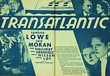 Transatlantic is a 1931 American pre-Code comedy film directed by William K. Howard and starring Edmund Lowe. It won an Academy Award for Best Art Direction by Gordon Wiles.[1][2]