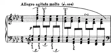 Musically, it is a study in pushing melodic lines to the razor's edge with passion and dramaticism while maintaining the melody. The climax occurs right after the softest part of the piece and is an octave D♭ played 23 times in a row with rhythmic changes and rapid left-hand arpeggios that constantly change theme.