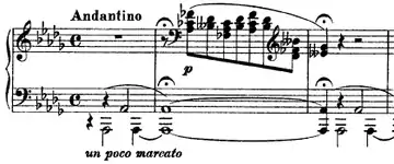 The piece begins with an introduction containing slow broken octaves in the left hand and chords in the right hand. After a group of arpeggios, the main theme is introduced in the left hand, a beautiful descent followed by a chromatic ascent with harmonies changing with each note. It is accompanied in the right hand by bass notes (crossing over) and octaves which seem to "sing along" with the left hand. Eventually, after a buildup with large chords in the right hand and octaves deep in the bass in the left hand, this theme is played again this time with harp like arpeggios in both hands. The piece continues in this manner for a while until the second theme, a chordal section marked Poco più mosso is introduced. It begins pianississimo but then grows to an appassionato climax. The music then seems to fade out, followed by an entire new section of the piece, marked Più lento con intimo sentimento. This section's song like melody is accompanied by arpeggiation in both hands (bringing out the main melody is a surprising technical feat, due to the wide spacing of the arpeggios in each hand). After a recitative passage, the music goes somewhere unexpected. The second theme is brought back, this time fortissimo and marked trionfante with chords in both hands. The most technically difficult part of the entire piece consists of multiple pages of chordal jumps and repetition, requiring a large amount of stamina. The music eventually dies down, and after an arpeggiated variation of the first theme, the music dies out.