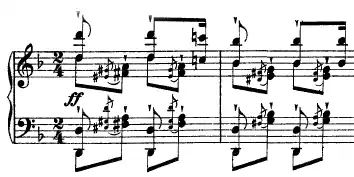 Mazeppa is ranked among the most difficult of the twelve études both musically and technically, perhaps second only to Feux Follets (the fifth in the set). According to G. Henle Verlag, a German publisher of sheet music, it is rated at the highest difficulty along with five other compositions within this set of Transcendental Études.[2] Successful execution requires great speed and endurance, as well as a complete familiarity with the piano due to the abundance of jumps that span more than an octave.