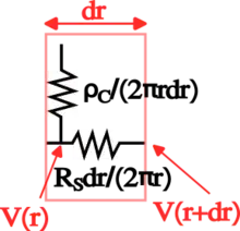 The original TLM method as described above has the drawback, that the current does not just flow within the area given by times . This means that the current density distribution also spreads to the vertical sides of the metallic pads in the figure in the TLM section, a phenomenon that is not considered in the derivation of the formula describing .[4][1] To account for this geometrical issue instead of rectangular metallic pads, circular pads with radius are used which are separated from a holohedral metallic coating by a distance (see figure to the right). When the total resistance between circular pad and holohedral coating is measured three distinguishable components contribute to the measured value, namely the gap resistance and the contact resistances at the inner and outer end of the gap area ( and ). This is expressed in the following formula: