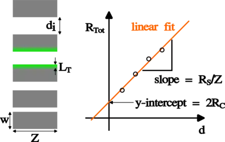 In the image to the right the distance between the pads increases from the bottom to the top. Therefore, when the resistance between adjacent pads is measured the total resistance increases accordingly as it is indicated in the graph beneath the depiction of the metal pads. In this graph the abscissa represents the distance between two adjacent metal pads while the circles represent measured resistance values. The total resistivity can be separated into a component due to the uncovered semiconductor substrate and a component that corresponds to the voltage drop in two metal-covered areas. The former component can be described with the formula , whereat represents the sheet resistance of the semiconductor substrate and the width of the metal pads. The other component that contributes to the total resistance is denoted by because when two adjacent pads are characterized two identical metallized areas have to be considered. This means that the total resistance can be written in the following functional form, with the pad distance as independent variable:
