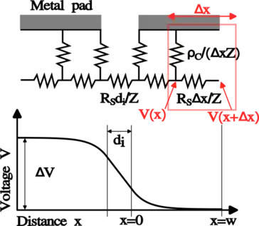 The last equation describes the voltage drop across the region covered by a metallic pad (compare with the figure in this section). By realizing that the resistance value can be expressed with and by setting in the last formula an expression can be found that relates to the specific contact resistivity :