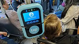 The TAP is a blue, or orange for reduced fare, credit-card-sized contactless stored value smart card which can hold a transit Pass or cash balance. The TAP card must be tapped on electronic readers to validate it when entering and transferring within the system. TAP readers are integrated in bus fare boxes, bus validators and standalone readers are located just outside the paid area of Metro Rail stations. Because Metro Rail has a mix of barrier free and faregated areas, it operates on a proof-of-payment system: as such, Metro's fare inspectors randomly check using a wireless handheld unit to make sure TAP users have validated their card. The cards may be "recharged" in person from ticket vending machines in Metro Rail stations, TAP Vendors, at Metro Customer Service Centers or online. The card is designed to reduce the number of transactions at Customer Service Centers. The card costs $2 and is only available with a fare media product (such as a day pass or stored value). Cards can also be purchased on Metro buses (since 15 September 2014) for $2 plus stored value (which works like a debit card). TAP cards expire approximately 3–10 years from purchase.[2]