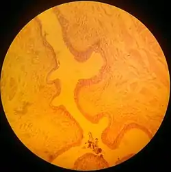 Transitional epithelium is made up of three types of cell layers: basal, intermediate, and superficial.[3] The basal layer fosters the epithelial stem cells in order to provide constant renewal of the epithelium.[4] These cells' cytoplasm is rich in tonofilaments and mitochondria; however, they contain few rough endoplasmic reticulum. The tonofilaments play a role in the attachment of the basal layer to the basement membrane via desmosomes.[5] The intermediate cell layer is highly proliferative and, therefore, provides for rapid cell regeneration in response to injury or infection of the organ or tube in which it resides.[4] These cells contain a prominent Golgi apparatus and an array of membrane-bound vesicles.[5] These function in the packaging and transport of proteins, such as keratin, to the superficial cell layer. The cells of the superficial cell layer that lines the lumen are known as facet cells or umbrella cells. This layer is the only fully differentiated layer of the epithelium. It provides an impenetrable barrier between the lumen and the bloodstream, so as not to allow the bloodstream to reabsorb harmful wastes or pathogens.[4] All transitional epithelial cells are covered in microvilli and a fibrillar mucous coat.[3]
