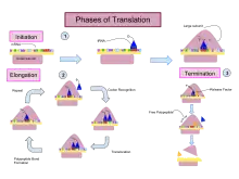 Even though the ribosomes are usually considered accurate and processive machines, the translation process is subject to errors that can lead either to the synthesis of erroneous proteins or to the premature abandonment of translation, either because a tRNA couples to a wrong codon or because a tRNA is coupled to the wrong amino acid. [10] The rate of error in synthesizing proteins has been estimated to be between 1 in 105 and 1 in 103 misincorporated amino acids, depending on the experimental conditions.[11] The rate of premature translation abandonment, instead, has been estimated to be of the order of magnitude of 10−4 events per translated codon.[12] The correct amino acid is covalently bonded to the correct transfer RNA (tRNA) by amino acyl transferases. The amino acid is joined by its carboxyl group to the 3' OH of the tRNA by an ester bond. When the tRNA has an amino acid linked to it, the tRNA is termed "charged". Initiation involves the small subunit of the ribosome binding to the 5' end of mRNA with the help of initiation factors (IF). In bacteria and a minority of archaea, initiation of protein synthesis involves the recognition of a purine-rich initiation sequence on the mRNA called the Shine-Dalgarno sequence. The Shine-Dalgarno sequence binds to a complementary pyrimidine-rich sequence on the 3' end of the 16S rRNA part of the 30S ribosomal subunit. The binding of these complementary sequences ensures that the 30S ribosomal subunit is bound to the mRNA and is aligned such that the initiation codon is placed in the 30S portion of the P-site. Once the mRNA and 30S subunit are properly bound, an initiation factor brings the initiator tRNA-amino acid complex, f-Met-tRNA, to the 30S P site. The initiation phase is completed once a 50S subunit joins the 30 subunit, forming an active 70S ribosome.[13] Termination of the polypeptide occurs when the A site of the ribosome is occupied by a stop codon (UAA, UAG, or UGA) on the mRNA, creating the primary structure of a protein. tRNA usually cannot recognize or bind to stop codons. Instead, the stop codon induces the binding of a release factor protein[14] (RF1 & RF2) that prompts the disassembly of the entire ribosome/mRNA complex by the hydrolysis of the polypeptide chain from the peptidyl transferase center [1] of the ribosome.[15] Drugs or special sequence motifs on the mRNA can change the ribosomal structure so that near-cognate tRNAs are bound to the stop codon instead of the release factors. In such cases of 'translational readthrough', translation continues until the ribosome encounters the next stop codon.[16]