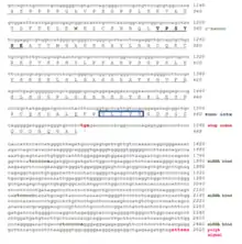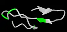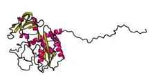 The secondary structure of the protein is predicted to consist of approximately alpha helices and beta sheets (the exact location and number of which depend on the program which is used for the prediction) but no coiled coils.[8][9][10] Diagrams of the predicted tertiary structure and transmembrane domains[11] are to the right.