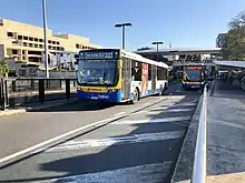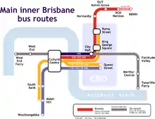 The free City Loop and Spring Hill Loop bus services provide high-frequency public transport access within the Brisbane CBD, and between the Brisbane CBD and Spring Hill.[27] The City Loop operates clockwise (route 40) and anti-clockwise (route 50) in the Brisbane CBD from designated purple-sign bus stops, using distinctive purple buses.[28] In 2021, a trial of electric buses began on the City Loop.[29] The Spring Hill Loop (route 30) operates on a continuous loop between the CBD and Spring Hill, stopping at yellow-sign bus stops, using distinctive yellow buses.[30]