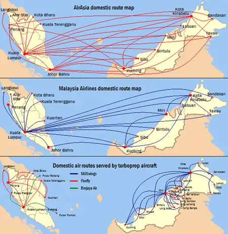 Malaysia has six international airports. The official airline of Malaysia is Malaysia Airlines, providing international and domestic air service alongside two other carriers. Most of the major cities are connected by air routes. The railway system is state-run, and covers a total of 1,849 km. Popular within the cities are commuter rail and rapid transit, which reduces the traffic load on other systems, and is considered safe, comfortable and reliable.