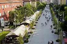 Roads in Pristina were in bad condition after the Kosovo War, forcing government investment to improve them. Today, all roads that connect the major villages with the urban centre are asphalted.[2] Roads that connect Pristina with other cities form the main routes of Kosovo's network. The M2, which starts from the north with Central Serbia, passes through Pristina and reaches the southern border with North Macedonia, shortly linking Pristina with the Pan European Corridor X. The M25 starts in Niš and passes through Pristina and Prizren, eventually reaching the border with Albania. This road is becoming more important for its south branch, linking Kosovo with Albania, where construction of the Rrëshen – Blinisht – Kukës road is ongoing. The M9 passes through the east administrative line with Central Serbia, through Pristina to Peja to the border with Montenegro.[3]