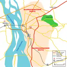 The city has a total road length of 472.28 km (293.46 mi), covering 454 km (282 mi) of municipal roads, 13.78 km (8.56 mi) of Roads & Buildings department roads and 4.5 km (2.8 mi) of National highways.[1] Main Road,[2] Stadium Road and Katheru Road[3] are the main arterial roads of the city. Tadithota,[4] Nandmam Ganiraju Junction,[5] Devi Chowk[6] and Morampudi Junction[7] are major junctions in the city. Godavari Bridge is the fourth longest rail-cum-road bridge in Asia. Godavari Fourth Bridge was later constructed to ease the traffic on Godavari Bridge.[3]