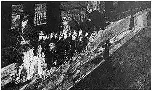 At Theresienstadt, the children were kept inside the trains for some time. Some prisoners of the camp were ordered to bring the children food but were forbidden to speak to them.[28] Despite the fact that Theresienstadt was a concentration camp where more than 30,000 people died,[9][29] the residents were shocked by the poor condition of the children, starving and dressed in ragged clothes; many were shoeless. Because the Germans wanted to prevent the Theresienstadt prisoners from learning about Treblinka and other extermination camps, they forbade the Theresienstadt prisoners from going outside or even looking out of windows while the children were marched to the disinfection building by a large group of SS men. The precautions taken mystified Theresienstadt prisoners, since no other transport had been segregated nor been composed exclusively of children.[15][30][31] Theresienstadt prisoners drew at least five images depicting the children marching through the streets.[32]
