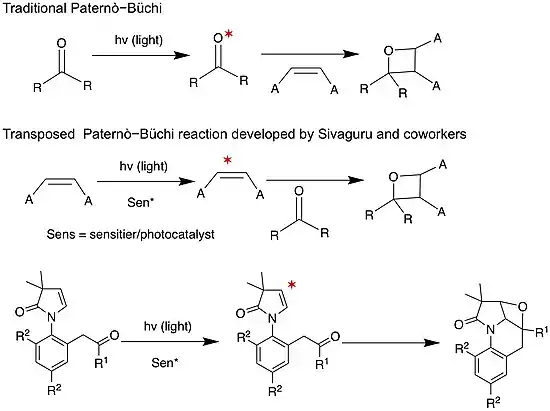 1. Kumarasamy, Elango; Raghunathan, Ramya; Kandappa, Sunil Kumar; Sreenithya, A.; Jockusch, Steffen; Sunoj, Raghavan B; Sivaguru, J. (2017-01-18). "Transposed Paternò–Büchi Reaction". Journal of the American Chemical Society. 139 (2): 655–662. doi:10.1021/jacs.6b05936. ISSN 0002-7863. PMID 27958726.