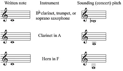 A transposing instrument is a musical instrument for which music notation is not written at concert pitch (concert pitch is the pitch on a non-transposing instrument such as the piano). For example, playing a written middle C on a transposing instrument produces a pitch other than middle C; that sounding pitch identifies the interval of transposition when describing the instrument. Playing a written C on clarinet or soprano saxophone produces a concert B♭ (i.e. B♭ at concert pitch), so these are referred to as B♭ instruments. Providing transposed music for these instruments is a convention of musical notation. The instruments do not transpose the music; rather, their music is written at a transposed pitch. Where chords are indicated for improvisation they are also written in the appropriate transposed form.