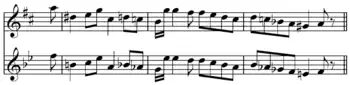 Transposition example from Koch[1] Play top  Play bottom . In this chromatic transposition, the melody on the first line is in the key of D, while the melody on the second line is identical except that it is a major third lower, in the key of B.
