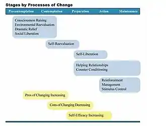 While most of these processes and strategies are associated with health interventions such as stress management, exercise, healthy eating, smoking cessation and other addictive behaviour,[24] some of them are also used in other types of interventions such as travel interventions.[25] Some processes are recommended in a specific stage, while others can be used in one or more stages.[1]