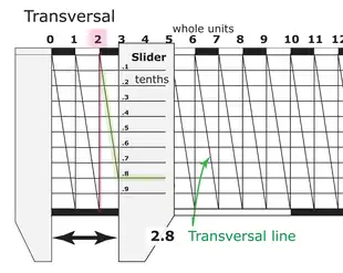 As seen in the illustration on the right, once the grid was scribed, diagonals (transverse lines) were scribed from the uppermost corner of a column in the grid to the opposite lowest corner. This line intersects the cross lines in the grid in equal intervals. By using an indicator such as a cursor or alidade, or by measuring using a pair of dividers with points on the same horizontal grid line, the closest point where the transversal crosses the grid is determined. That indicates the fraction of the graduation for the measure.