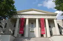 The academic side of campus lies to the East of North Broadway, one of the major streets in Lexington. Old Morrison is the main administration building for the university. Designed by pioneer Kentucky architect Gideon Shryock and erected in 1833 under the supervision of Henry Clay (then professor of law at Transylvania), Old Morrison is the central image on the city seal of Lexington. It houses the offices of financial aid, accounting, the registrar, the president, the dean, communications, the Center for Academic and Professional Enrichment, and more. The building also holds the tomb of Constantine Rafinesque, professor of natural science at the university from 1819 to 1826, and Sauveur Francois Bonfils, who taught at the university from 1842 to 1849 (a native of France, he apparently was forced to flee because of political discord).[17] During the Civil War, Old Morrison served as a hospital for Union and Confederate soldiers.[18] It was gutted by fire in 1969 but was renovated and reopened in 1971. It was designated a National Historic Landmark in 1965, in recognition of the university's status as the oldest west of the Allegheny Mountains.[19]