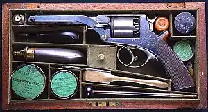 The Tranter revolver was a double-action cap & ball revolver invented around 1856 by English firearms designer William Tranter (1816–1890). Originally operated with a special dual-trigger mechanism (one to rotate the cylinder and cock the gun, a second to fire it) later models employed a single-trigger mechanism much the same as that found in the contemporary Beaumont–Adams revolver.