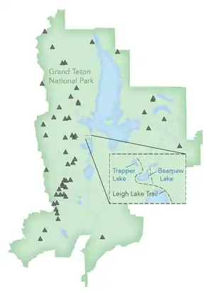 Trapper Lake is located in Grand Teton National Park, in the U. S. state of Wyoming.[2] Trapper Lake is only 0.10 mi (0.16 km) north of Bearpaw Lake and at the eastern base of Mount Moran. The lake can be accessed on foot by the Leigh Lake Trail which is an easy 4.6-mile (7.4 km) hike on level terrain.[3]