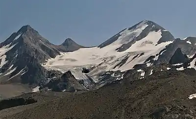 ![]() Trapper Peak (left), Baker Glacier, and Mt. Baker (right) viewed from northwest | |