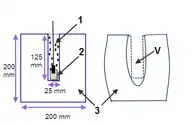 The test is performed by loading a 10-gram foil-wrapped sample of the explosive into a hole drilled into a lead block with specific dimensions and properties (a soft lead cylinder, 200 mm diameter and 200 mm high, with the hole 125 mm deep, and 25 mm diameter).[1] The hole is then topped up with sand, and the sample is detonated electrically. After detonation, the volume increase of the cavity is measured. The result, given in cm3, is called the Trauzl number of the explosive.