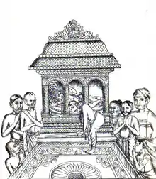 Maharajah Sree Anizham Thirunal dedicated the Kingdom of Travancore to his family deity Sri Padmanabhaswamy in 1750 January 3 and after that he was referred to as Sree Padmanabhadasa Vanchipaala Maharajah Sree Anizham Thirunal Veerabaala Marthanda Varma Kulasekharaperumal. The Kings of Travancore, taking the title of "Sree Padmanabhadasa," ruled the kingdom as the servant of that deity. This important donation of the Kingdom to the Temple was known as "Thripadidaanam."[17] Travancore as a whole, thus became the property of Sri Padmanabhaswamy, the deity of the Travancore royal family or in other words "God's Own Country."[18] It is erroneously believed that use of the title "Sree Padmanabhadasa" before royal male members' names came into being after Thrippadidaanam, but this title was in use even in the 16th century. During the first birthday ceremony of Maharajah Karthika Thirunal Rama Varma (Dharmaraja) in 1725, he is referred to as "Sree Padmanabhadasa" which was much before the Thrippadidaanam (1750) by Maharajah Anizham Thirunal Veerabaala Marthanda Varma. The title of "Sree Padmanabhadasa" is prefixed to the name of every Travancore King while the royal women are "Sree Padmanabhasevinis." In order to get the eligibility for attaining the title of "Sree Padmanabhadasa," certain rituals must be completed at the birth of new royal male members. On the first birthday of every royal male members would be put on the 'Ottakkalmandapam' of the Sree Padmanabhaswami Temple and holy water from the temple will be sprinkled on the baby and only after completion of this ceremony, the royal child is proclaimed as "Sree Padmanabhadasa." The female members also have a ritual called "Padiyettam" which is conducted only after their "Pallikettu" (wedding of Travancore Princesses and Queens). Only those male and female members who complete these ceremonies are allowed in the temple affairs and are also provided respect as well as the titles associated with temple as well as the royal family.'[19][20]