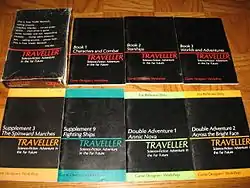 Traveller is a science fiction role-playing game first published in 1977 by Game Designers' Workshop. Marc Miller designed Traveller with help from Frank Chadwick, John Harshman, and Loren Wiseman.[1] Editions were published for GURPS, d20, and other role-playing game systems. From its origin and in the currently published systems, the game relied upon six-sided dice for random elements. Traveller has been featured in a few novels and at least two video games.