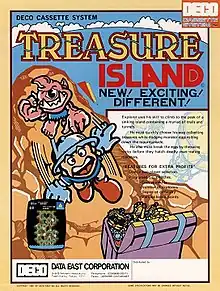Treasure Island is a 1981 arcade video game from Data East.[3] It was released for the DECO Cassette System as well as a standalone cabinet.[4] Treasure Island is a vertically scrolling game with isometric graphics. The goal is to climb a sinking island while gathering treasure.[4]