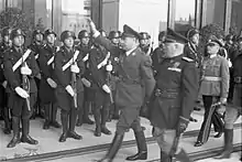 The following day, Pavelić and the Italian-based Ustaše were gathered in Pistoia. Before departing by train to Trieste and then by road towards Zagreb, they were issued Italian uniforms, buses, cars, and light arms. When they reached Karlovac on 14 April, however, Mussolini dispatched Filippo Anfuso by plane to intercept Pavelić and obtain a written, public confirmation that he would recognise Italian claims in Dalmatia. Pavelić complied, and Anfuso left him to proceed,[7] reaching Zagreb in the early morning of 15 April with 195 Ustašas in tow.[9] Yugoslavia surrendered shortly thereafter, on 17 April 1941.[10]