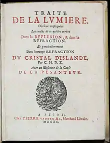 Treatise on Light: In Which Are Explained the Causes of That Which Occurs in Reflection & Refraction (French: Traité de la Lumière: Où Sont Expliquées les Causes de ce qui Luy Arrive Dans la Reflexion & Dans la Refraction) is a book written by Dutch polymath Christiaan Huygens that was published in French in 1690. The book describes Huygens's conception of the nature of light propagation which makes it possible to explain the laws of geometrical optics shown in Descartes's Dioptrique, which Huygens aimed to replace.[1]