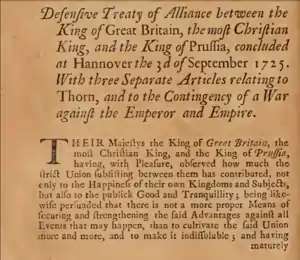 The Treaty of Hanover was a treaty of defensive alliance signed on 3 September 1725 by the Kingdom of Great Britain, the Electorate of Hanover, the Kingdom of France, and the Kingdom of Prussia. The alliance was formed to combat the power of the Austro-Spanish alliance founded at the Peace of Vienna months earlier in May 1725.[1]