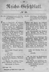 The Treaty of Versailles of 1871 ended the Franco-Prussian War and was signed by Adolphe Thiers of the Third French Republic and Otto von Bismarck of the newly-formed German Empire on 26 February 1871. A preliminary treaty, it was used to solidify the initial armistice of 28 January between the powers.[1] It was ratified by the Treaty of Frankfurt on 10 May of the same year which confirmed the supremacy of the German Empire, replacing France as the dominant military power on the European continent.