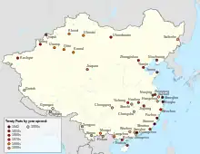 Treaty ports (Chinese: 商埠; Japanese: 条約港) were the port cities in China and Japan that were opened to foreign trade mainly by the unequal treaties forced upon them by Western powers, as well as cities in Korea opened up similarly by the Japanese Empire.[1]