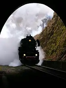 The Polish railway was very heavily used. An average of 420 German military trains were passing through every 24 hours on top of internal traffic already in 1941.[91] The Holocaust trains passage to their destination was routinely delayed; some transports took many days to arrive.[92] Hundreds of prisoners were murdered by exhaustion, suffocation and thirst while in transit to the camp in the overcrowded wagons.[93] In extreme cases, such as the Biała Podlaska transport of 6,000 Jews travelling only a 125 km (78 mi) distance, up to 90 percent of people were already dead when the sealed doors were opened.[92] From September 1942 on, both Polish and foreign Jews were greeted with a brief verbal announcement. An earlier signboard with directions was removed because it was clearly insufficient.[94] The deportees were told that they had arrived at a transit point on the way to Ukraine and needed to shower and have their clothes disinfected before receiving work uniforms and new orders.[75]