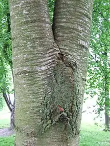 Where a junction forms in a tree and bark is incorporated into the join, this is referred to as an 'included bark junction' or 'bark inclusion'. A common cause of bark being incorporated into the junction is that the junction is braced by the touching of branches or stems set above that junction (in arboriculture, these branch interactions are termed 'natural braces'). Such included bark junctions can be substantially weaker in strength than normal tree forks, and can become a significant hazard in a tree, particularly when the bracing branches are shaded out or pruned out of the tree.[13][14] Research has shown that in hazel trees, the more the included bark is occluded within new wood growth, the stronger that junction will be, with the weakest forks being those with a large amount of unoccluded bark at their apex.[15] Common tree care practices are to prune out such bark-included forks at an early stage of the tree's development, to brace the two arising branches above such a junction so that they can not split apart (using a flexible brace) or to reduce the length of the smaller arising branch, so that it is subordinated to the larger branch.[16] Care should be taken not to prune out 'natural braces' set above weak tree forks in mature trees unless that is absolutely necessary.[17]