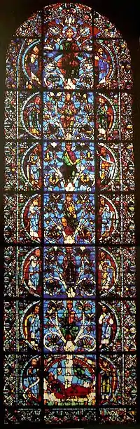 Among the famous stained glass windows of Chartres Cathedral in Northern France is the Jesse Tree window, of 1140–50, the far right of three windows above the Royal Portal and beneath the western rose window. It derives from the oldest known (and almost certainly the original) complex form of the Jesse Tree, with the tree rising from a sleeping Jesse, a window placed in the Saint-Denis Basilica by Abbot Suger in about 1140, which is now heavily restored.[4][14]