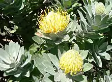 The flower heads sit atop a stalk of about 1½ cm (0.6 in) long, are globe- to egg-shaped, and 7–9 cm (2.8–3.5 in) in diameter. They can be found individually or mostly with two or three together near the tip of the branch, regularly partly enclosed by leaves. The common base of the flowers of the same head is narrowly cone-shaped with a pointy tip, 2½–3 cm (1–1.2 in) long and 1–1½ cm (0.4–0.6 in) in diameter. The bracts that subtend the flower head are oval in shape with a point tip, 1¼–1½ cm (0.5–0.6 in) long and approximately 1 cm (0.39 in) wide, tightly overlapping, with a rubbery consistency and softly hairy. The bracts supporting the individual flowers enclose them at their base, have a suddenly pointed tip, and are about 2 cm (0.79 in) long, and about 1 cm (0.39 in) wide, rubbery in consistency, woolly at the base and less so near the top. The perianth is 3½–5 cm (1.4–2.0 in) long and yellow in colour. The lower 1 cm (0.4 in) is fused, cylindric, and hairless. The free parts of the four perianth claws curl back when the flower opens, those to the sides and facing the rim of the flower head densely set with long hairs. The one facing the center of the head minutely powdery or very shortly softly hairy. The perianth limbs are lance-shaped with a pointy tip, 6–8 mm (0.24–0.31 in) long, and have long hairs pressed to the surface, except for the one facing the center that is minutely powdery. The style is stout, 1–1½ mm (0.04–0.06 in) thick and 4½–5½ cm (1.8-2.2 in) long, at first bent towards the center of the flower head but getting more straight with age. It is topped by a slight thickening that is called the pollen presenter, which has a broad conical shape with a pointy tip, is 4–5 mm (0.16–0.20 in) long and about 2 mm (0.079 in) wide. Subtending the ovary are four lance-shaped scales with a pointy tip of about 2 mm (0.079 in) long.[2]