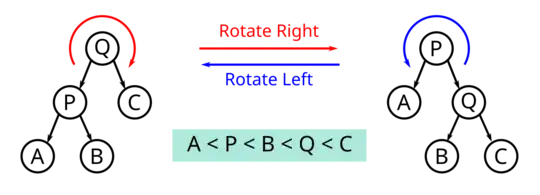 The right rotation operation as shown in the adjacent image is performed with Q as the root and hence is a right rotation on, or rooted at, Q. This operation results in a rotation of the tree in the clockwise direction. The inverse operation is the left rotation, which results in a movement in a counter-clockwise direction (the left rotation shown above is rooted at P). The key to understanding how a rotation functions is to understand its constraints. In particular the order of the leaves of the tree (when read left to right for example) cannot change (another way to think of it is that the order that the leaves would be visited in an in-order traversal must be the same after the operation as before). Another constraint is the main property of a binary search tree, namely that the right child is greater than the parent and the left child is less than the parent. Notice that the right child of a left child of the root of a sub-tree (for example node B in the diagram for the tree rooted at Q) can become the left child of the root, that itself becomes the right child of the "new" root in the rotated sub-tree, without violating either of those constraints. As you can see in the diagram, the order of the leaves doesn't change. The opposite operation also preserves the order and is the second kind of rotation.