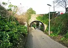 The main line crossed the Trenance Valley on a viaduct 98 feet (30 m) high and 210 yards (192 m) long, of timber trestles on seventeen stone piers.[6] Its frail appearance led to its being known as the Tolcarne Spider.[12][14]