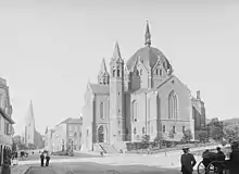 Trinity Church (in Norwegian, Trefoldighetskirken), is a church in the Hammersborg neighborhood in central Oslo, Norway. Trinity Church is neighbor of the government buildings in Regjeringskvartalet. It is the parish church of the parish of Trinity, belonging to the Diocese of Oslo of the Church of Norway. It is one of the largest churches in Oslo (1000 seats). The church itself is in the raw red brick, while the vaults, arches and small columns have gray scale color. The nave is octagonal with a Greek cross superimposed, with the choir in the apse, shallow transept and rectangular entrance flanked by two slender, octagonal bell towers. A central dome rises above the church.[1] Trinity Church is the largest church in Oslo and one of the largest of the many octagonal churches in Norway, but one of few octagonal churches constructed in red brick.